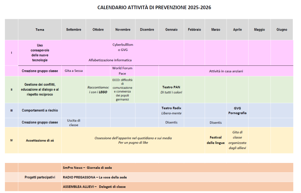Il consiglio di direzione della scuola media di Pregassona ritiene che la prevenzione da comportamenti a rischio passi necessariamente attraverso il rafforzamento delle competenze psicosociali dei ragazzi, quali ad esempio l’empatia, la capacità di resistere alla pressione del gruppo di pari e di affermare la propria opinione, la gestione dei conflitti, la capacità di prendere delle decisioni o, ancora, lo sviluppo di un pensiero critico.